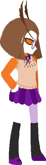Twyla is a short young woman, described by Mary as being a “small girl” like her. She has straight brown hair, that is shaped in a way that resembles the face of an owl. Her eyes have an orange sclera and she has small brown pupils, with purple framed circle glasses on top. She has long eyebrows, described as being spectacular and resembling an owl.