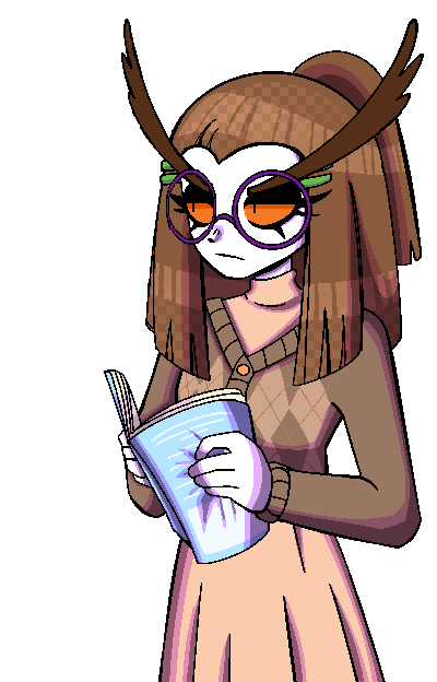 Twyla is a short young woman, described by Mary as being a “small girl” like her. She has straight brown hair, that is shaped in a way that resembles the face of an owl. Her eyes have an orange sclera and she has small brown pupils, with purple framed circle glasses on top. She has long eyebrows, described as being spectacular and resembling an owl.